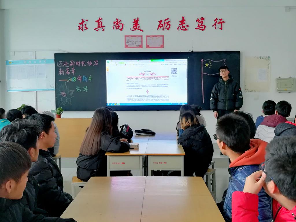 活动最后,又组织同学们共同学习了学院《迈进新时代续写新篇章——2018年新年致辞》,让同学们了解学院2017年取得的巨大成绩,感受学院的办学实力和社会影响力,引导学生脚踏实地,践行校训精神,为优质校建设增光添彩。