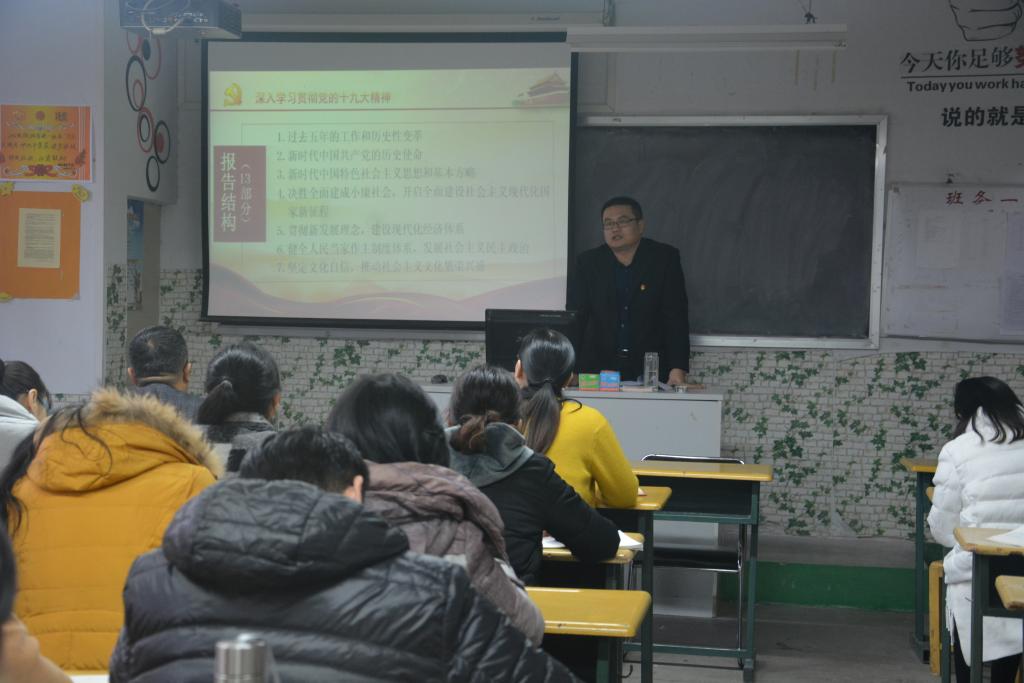 会议在党支部负责人的主持下进行。会上,党支部负责同志就十九大精神进行宣讲,深入贯彻落实十九大精神。负责同志主要要求党支部全体成员牢牢把握大会的主题,树立两个意识,深刻领会过去五年取得的巨大成就,在牢记中国共产党人的历史使命的同时,深刻理解社会主要矛盾转变等重大政治论。会议指出,党的十九大报告内容丰富、博大精深,与每一位教师都关系密切,全体支部成员更要充分认识党的十九大精神意义,深刻领会、准确把握党的十九大精神实质和丰富内涵。最后要求全体党支部成员在“学懂、弄通、做实”上下大功夫,围绕一个目标,结合自身工作,开展三方面审视,为建设“潍坊龙头、全省前列、国内知名、有国际影响”的现代化优质高职院校做出自己的贡献。