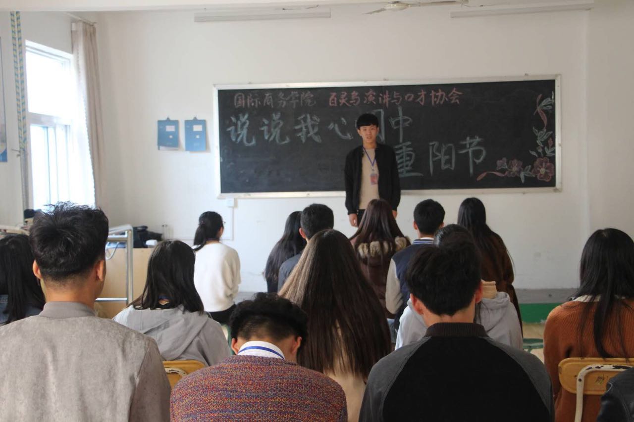 为丰富重阳节内涵,扩大中华传统节日文化传播,在重阳节即将来临之际,国际商务学院“百灵鸟”演讲与口才协会举行“说说我心目中的重阳节”主题演说活动。活动中,协会成员们用演说的形式,诉说着自己心中的重阳节。有说登高望远展现节日习俗的,有说帮助老人彰显敬老精神的,有仙鹤傲立祝愿老人健康长寿的等等,体现了同学们传播风俗文化、弘扬中华美德、继承孝善精神的决心,彰显了传统文化熏陶下的新时代青年积极向上的健康姿态。