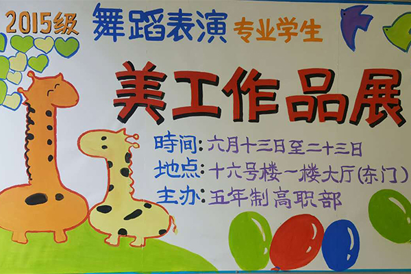 6月13日至23日,五年制高职部在奎文校区十六号楼一楼大厅举办2015级舞蹈表演专业学生美工作品展览。