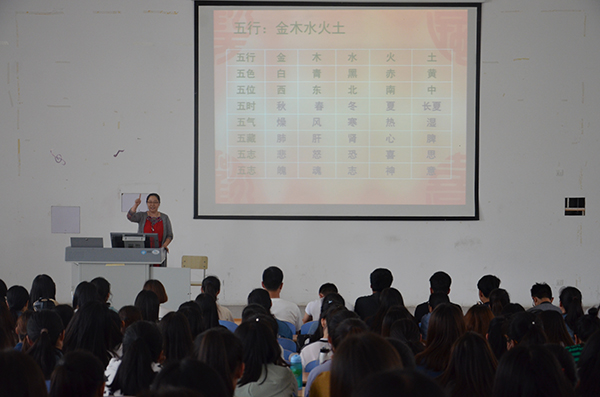 讲座由潍坊正安堂健康管理咨询公司董事长、著名中医临床专家刘莉莉老师主讲。刘老师多年来一直致力于中医推广,有丰富的医学知识和中医管理经验。《黄帝内经》是我国最早的医学典籍之一,为中国传统医学四大经典之首,蕴含着丰富的中医理论和哲学智慧。讲座中,刘老师结合大学生生理心理特点,围绕衣食住行等方面,从疾病的出现到疾病的防御,从病情的内因到病情的外因,就如何从医学角度科学地做好自我保健做了详细的讲解,阐述了科学养生的重要性,告诉大家在树立正确饮食作息观念的同时,也要在生活中加强锻炼,保持良好的心态。