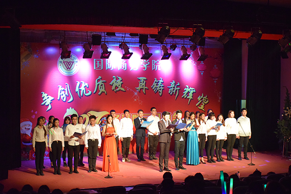 12月22日,国际商务学院“争创优质校•再铸新辉煌”2017圣诞暨元旦晚会在奎文校区报告厅举行。学院副院长贺志强及各部门、二级学院负责同志与国际商务学院全体师生观看了晚会。