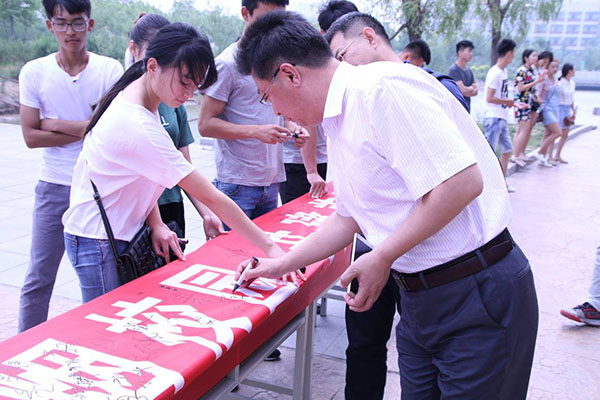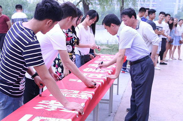 活动现场,信息工程学院全体男生在横幅上郑重签下自己的名字,约定自觉加入禁烟活动行列。同时,活动现场吸引了各二级学院前来就餐的领导、老师和同学们的关注,他们纷纷停下脚步,或是走上前认真签名,或是拿出手机拍照。不到半个小时,横幅上已经密密麻麻签满了名字。(张宝华供稿)