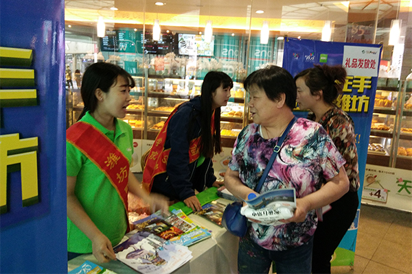 同学们在活动现场分别负责现场的宣传页发放、旅游线路介绍、潍坊旅游一卡通办理以及在咨询台帮助参会人员解答问题。同学们结合所学专业知识,对遇到各种问题提出了相应的解决方案,获得了旅行社工作人员和参会市民的一致好评。