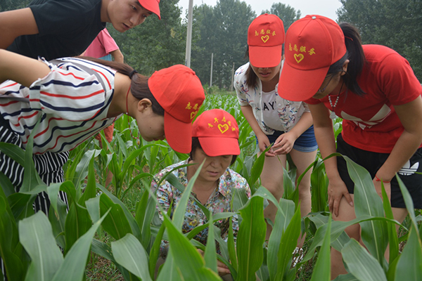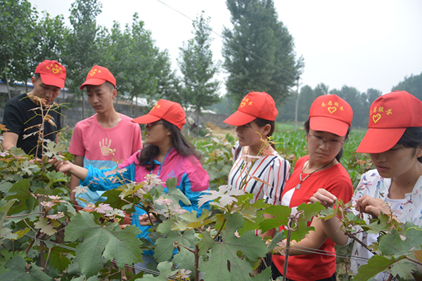 实践团队在指导老师的带领下,与峡山生态经济发展区郑公街道潘刘屯村包村“第一书记”安守强同志对接,随村主任等工作人员和部分农户一起深入田间地头,了解当地农业生产和农村经济发展现状。师生通过对当地的村容村貌、人员结构、气候、土壤、生态环境及交通等特点的了解,和村委工作人员一起分析了当地发展中存在的问题、发展生态农业的有利条件,并提出了发展生态旅游农业的设想。同时青年志愿者们在必赢农业生产专家席敦芹教授的指导下,对玉米、酿酒葡萄的生长进行了观察,席教授耐心细致的指导青年志愿者们识别玉米生长常见病虫害、辨别酿酒葡萄与食用葡萄的不同,通过对比不同田地的葡萄生长状况,让同学们认识到了精细化管理的重要性。