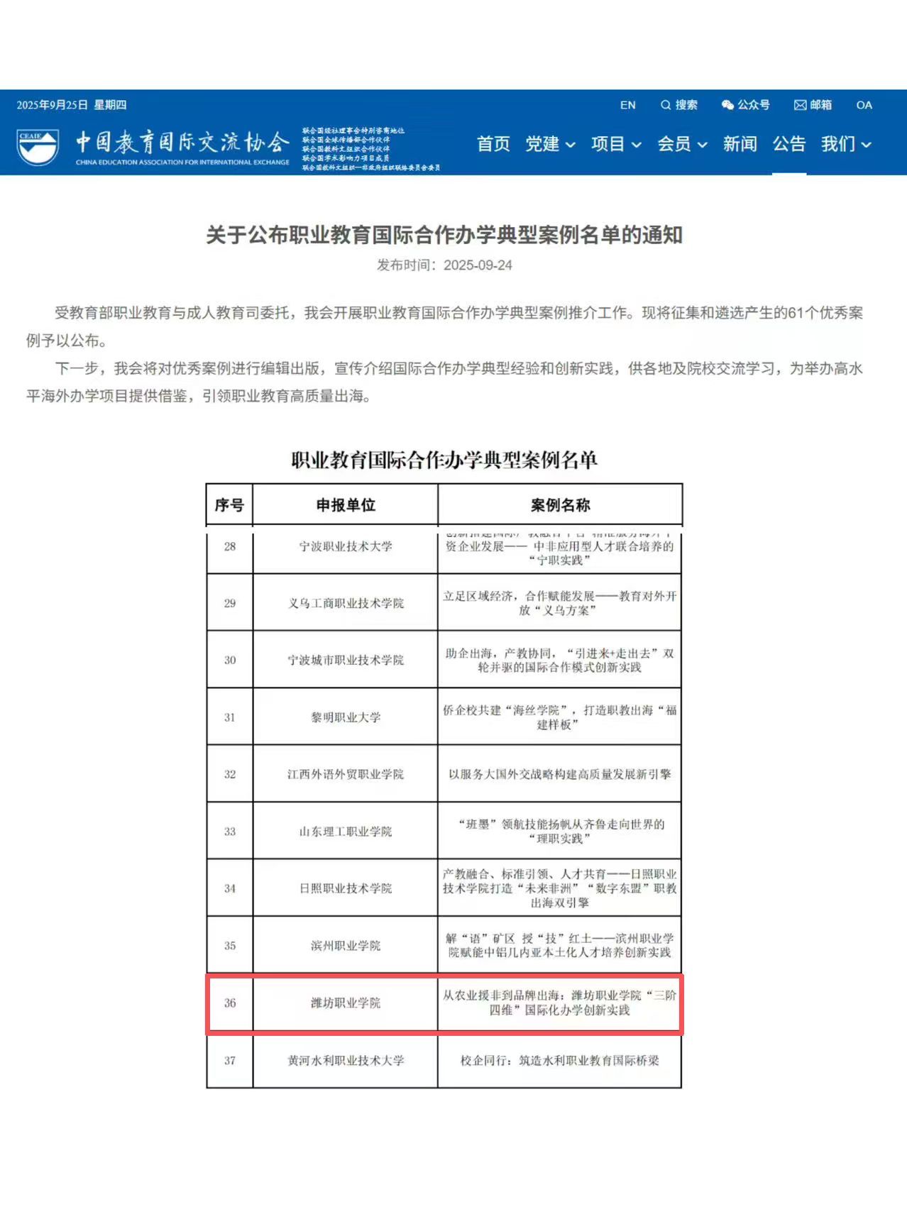 9月24日,由教育部职业教育与成人教育司组织的职业教育国际合作办学典型案例遴选结果公布,全国共有61个案例入选。必赢报送的《从农业援非到品牌出海:“三阶四维”国际化办学创新实践》成功入选,成为职业教育国际合作领域的典型代表。
