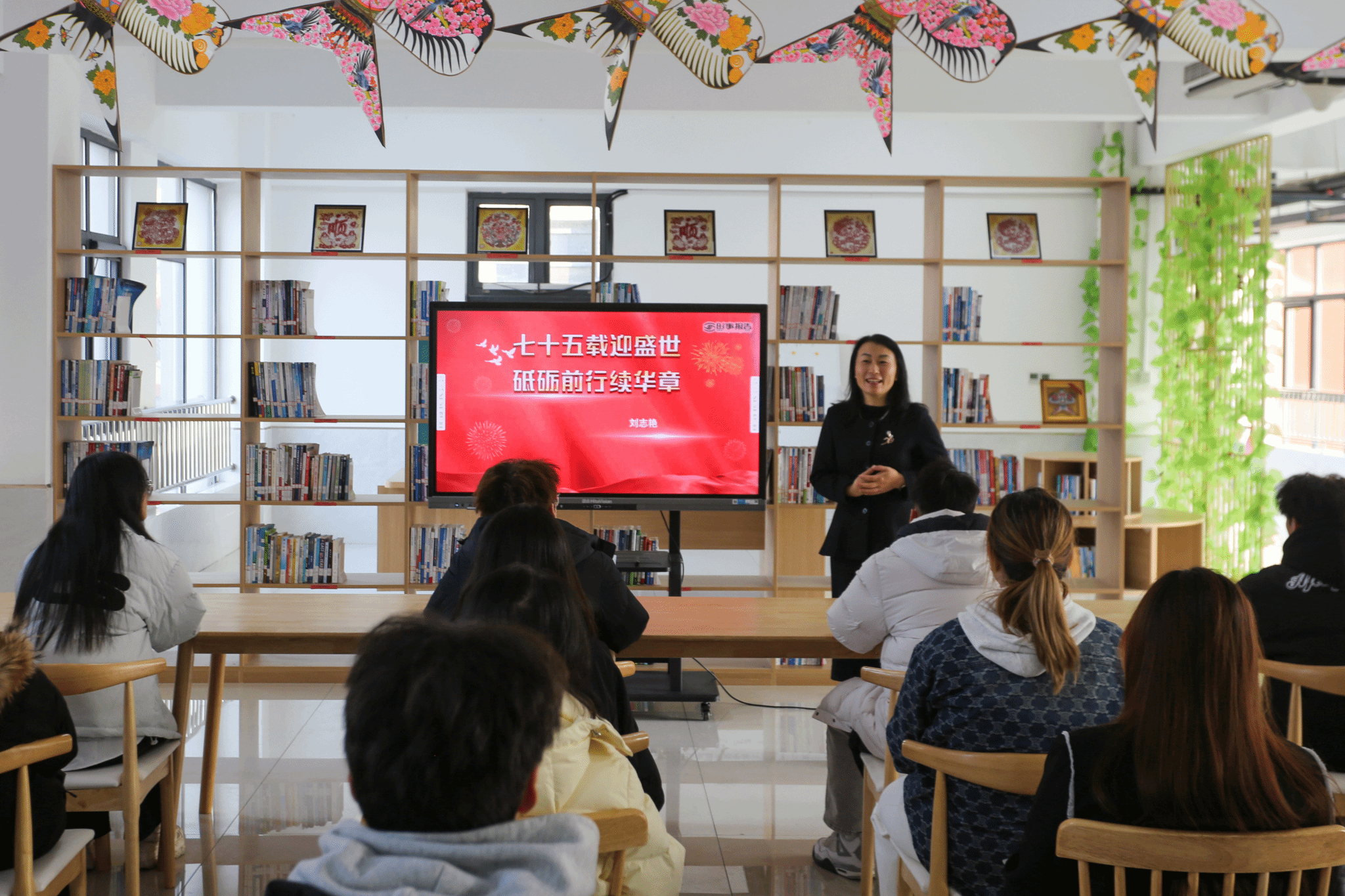 刘志艳以《七十五载逢盛世,砥砺前行续华章》为主题,带领同学们学习了七十五载中华盛世、六十八年潍职发展、新时代青年风采等三个方面内容,通过回顾新中国成立75周年以来取得的巨大成就、重温潍职68年的建设历程、分享学院优秀毕业生的故事,引领青年学生要树立远大理想、珍惜宝贵时光、陶冶高尚情操、锤炼健全人格,为强国建设贡献青春力量。