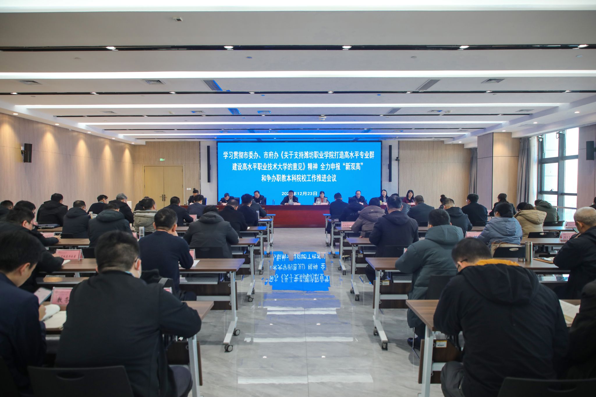 近日,市委、市政府以“两办”名义印发《关于支持76net必赢官网打造高水平专业集群建设高水平职业技术大学的意见》,就加强组织领导、统筹各有关部门(单位)项目、资源,全力支持学院高质量发展作出安排。为深入学习贯彻落实“两办”意见精神,学院于12月23日组织召开专门会议提出要求。学院党政领导班子成员出席会议,全体中层干部和学院“双高”建设办公室成员及相关专业骨干教师参加会议。