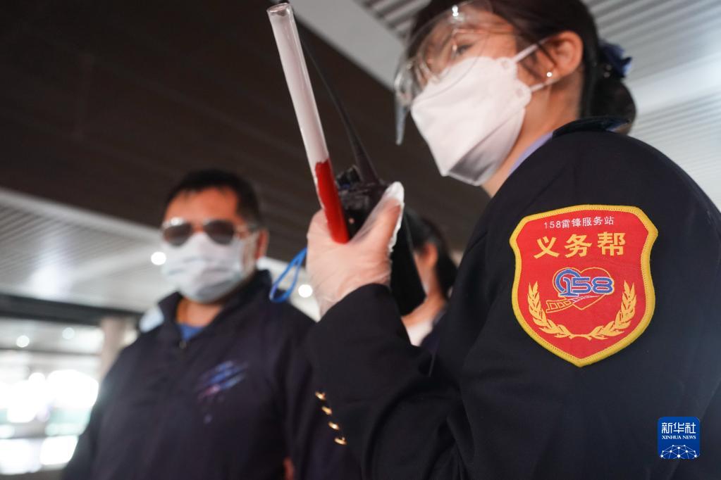 2022年3月7日,在南京南站,“158”雷锋服务站工作人员顾娟陪着盲人旅客等待火车进站。