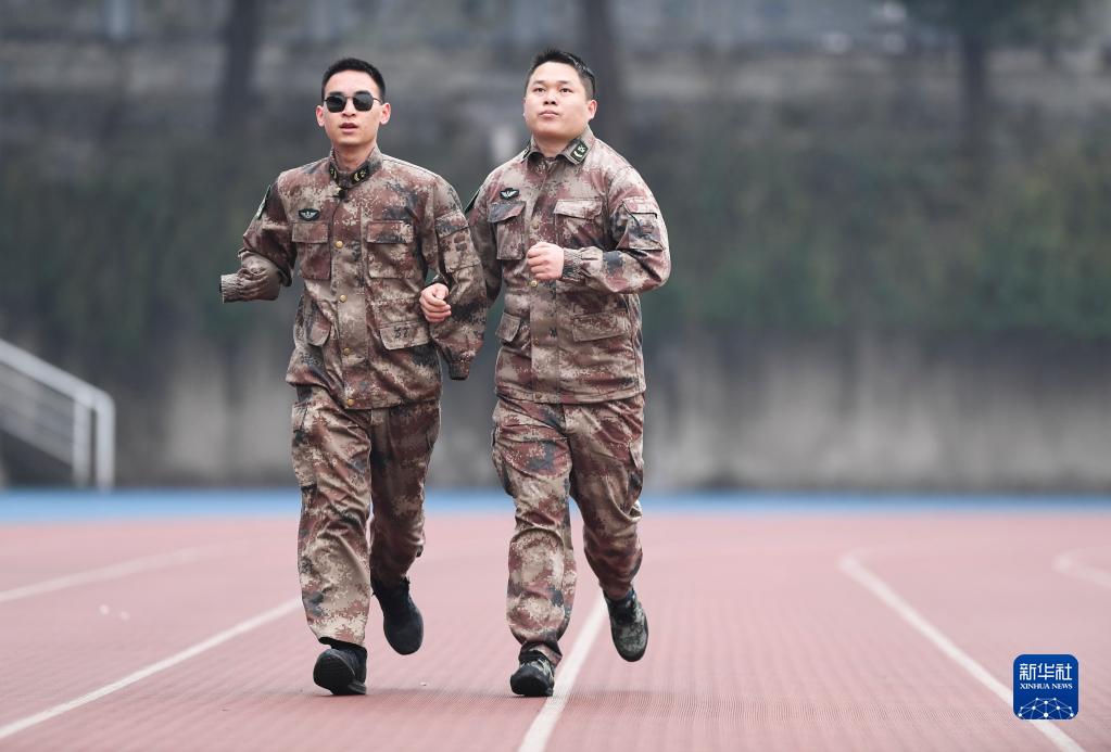 2020年1月2日,“排雷英雄战士”杜富国(左)和战友在陆军军医大学操场上跑步。